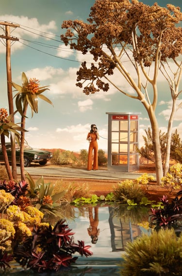 Je construis mes décors en miniature et chaque détail est pensé avec précision pour créer un monde stylisé, légèrement décalé, traversé d’une nostalgie malicieuse.
